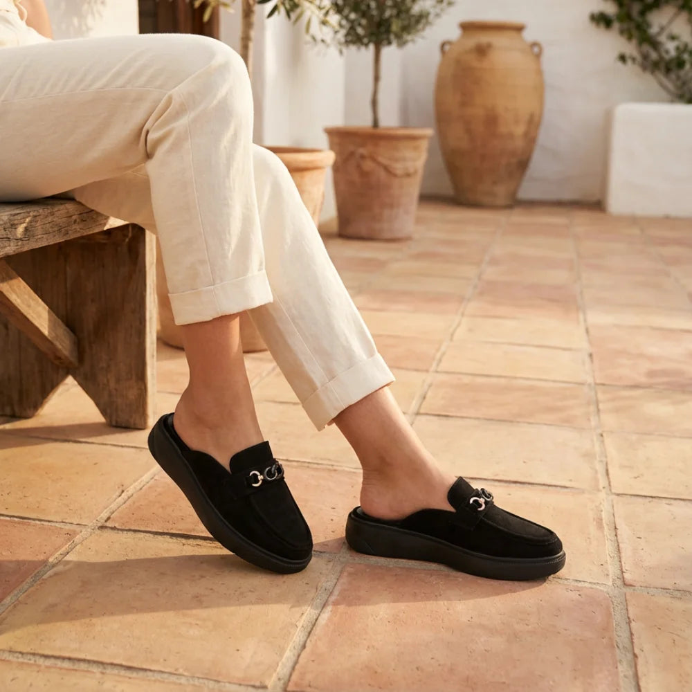 La semelle épaisse et confortable assure une bonne stabilité et un confort durable tout au long de la journée, rendant ces sabots parfaitement adaptés à la marche légère et à un usage fréquent, sans sensation de fatigue. Le détail métallique élégant sur l’avant apporte une touche sophistiquée et discrète, pour un design équilibré et intemporel.